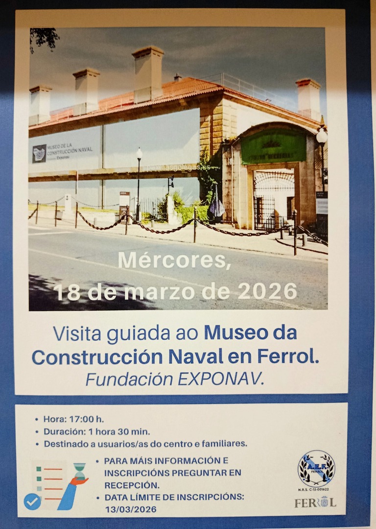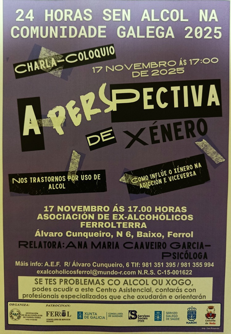 O 24/11/2021, na Escola Náutico-Pesqueira de Ferrol, se impartira unha charla a dous grupos de alumnos sendo a primeira as 10:30 horas e a segunda as 11:30 horas dentro do Programa de Sensibilización Escolar sobre Alcol e Xogo